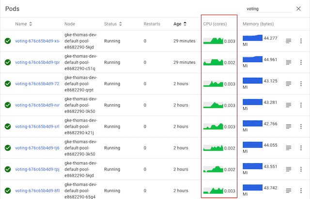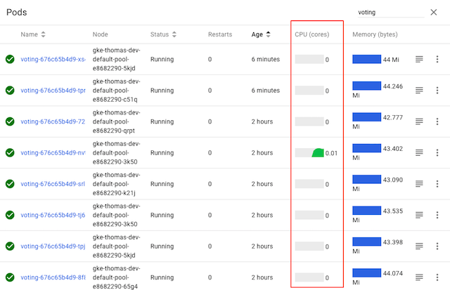 그림과 같이, 모든 파드에 대한 CPU 그래프가 활성화되어 모든 파드가 —코드를 변경하지 않았지만— 트래픽을 받고 있다. 짜잔, 마법처럼 gRPC 로드 밸런싱이 됐다!